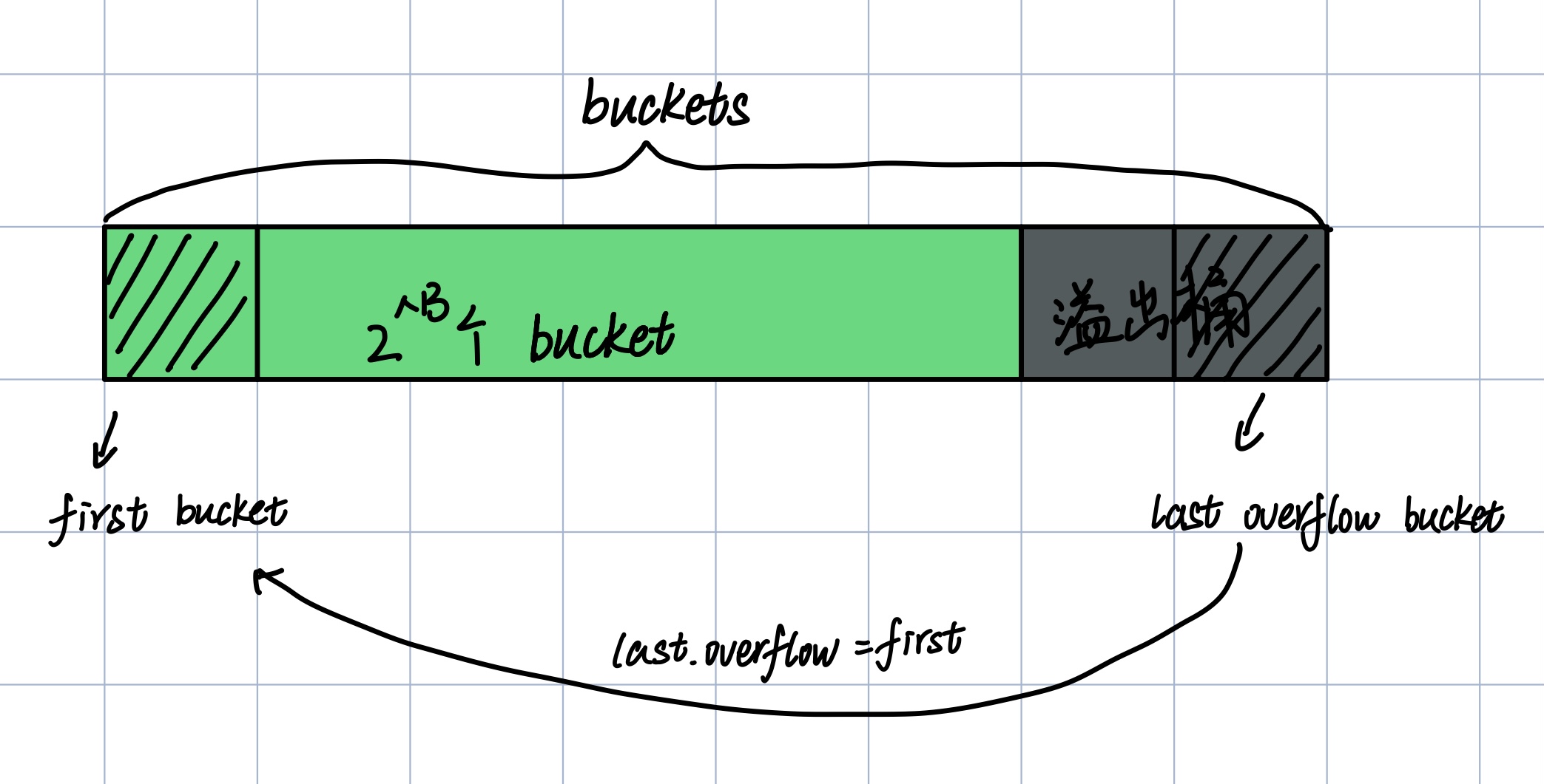last.setoverflow(t, (*bmap)(buckets)) // 溢出桶的最后一个桶的overflow指向了buckets的第一个桶